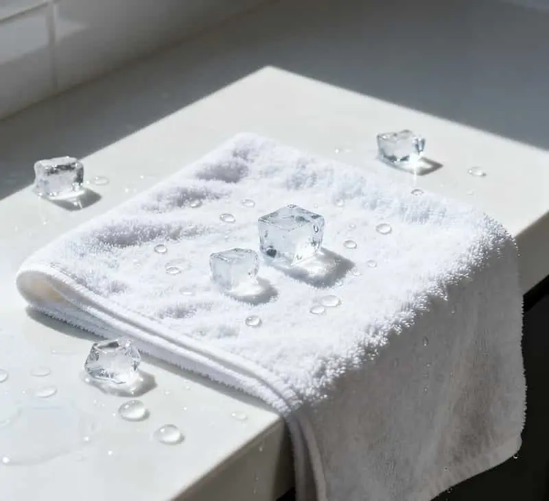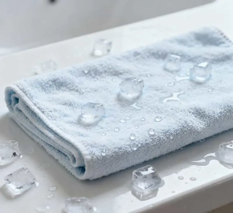 • 乾淨毛巾浸冷水 → 擰至半乾 → 折疊 → 放入冰箱冷藏 10 分鐘(或加冰塊包裹)。